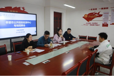会上,孝感市公共检验检测中心招聘负责人播放了单位宣传视频,就单位基本情况、招聘岗位、薪酬待遇及工作科室情况作了详细介绍,让同学们对单位有了深入的了解。宣讲会结束尾声,单位现场接收毕业生简历并进行面试,我院毕业生踊跃投递简历,主动咨询岗位需求并积极与用人单位沟通交流。